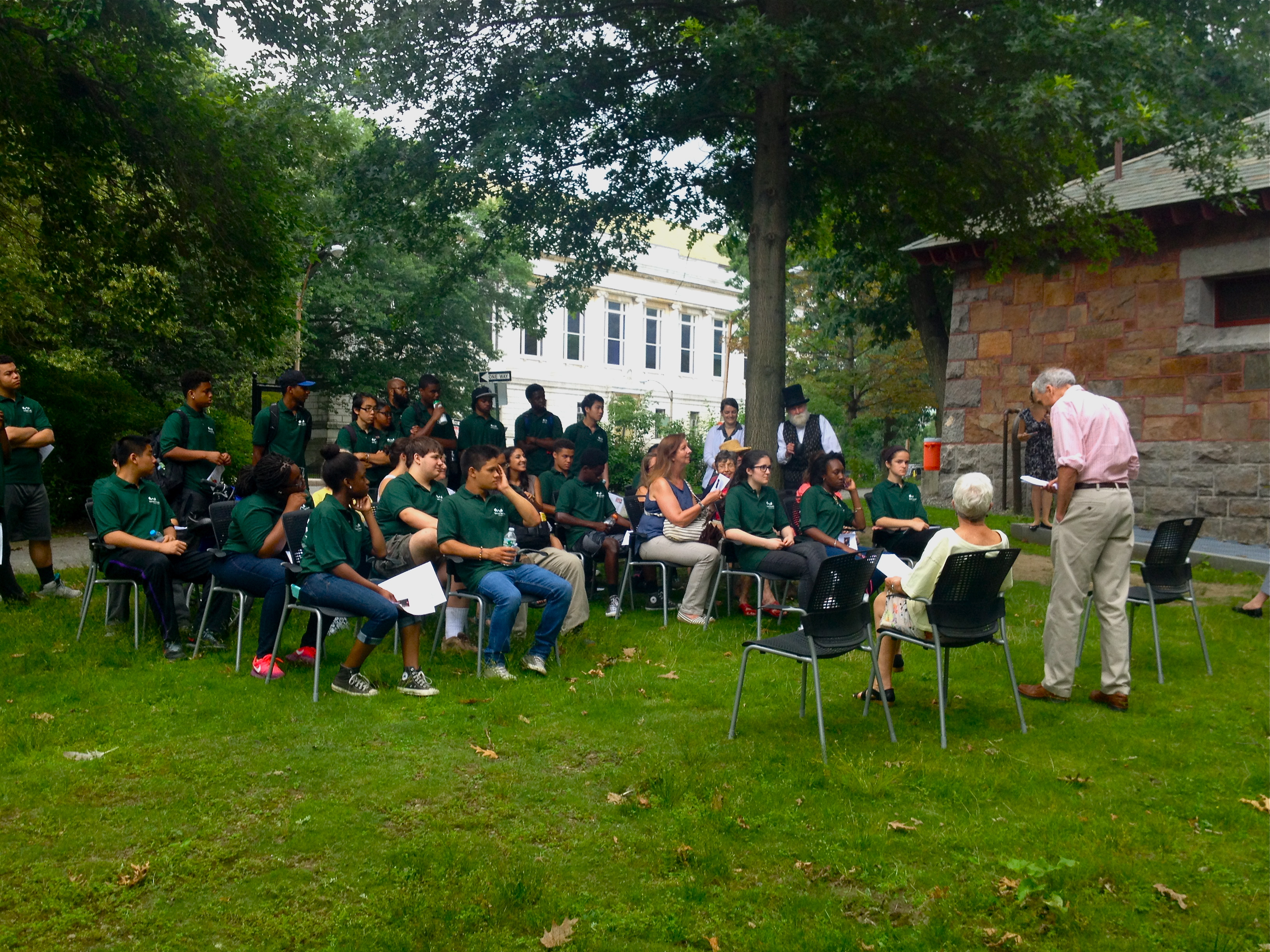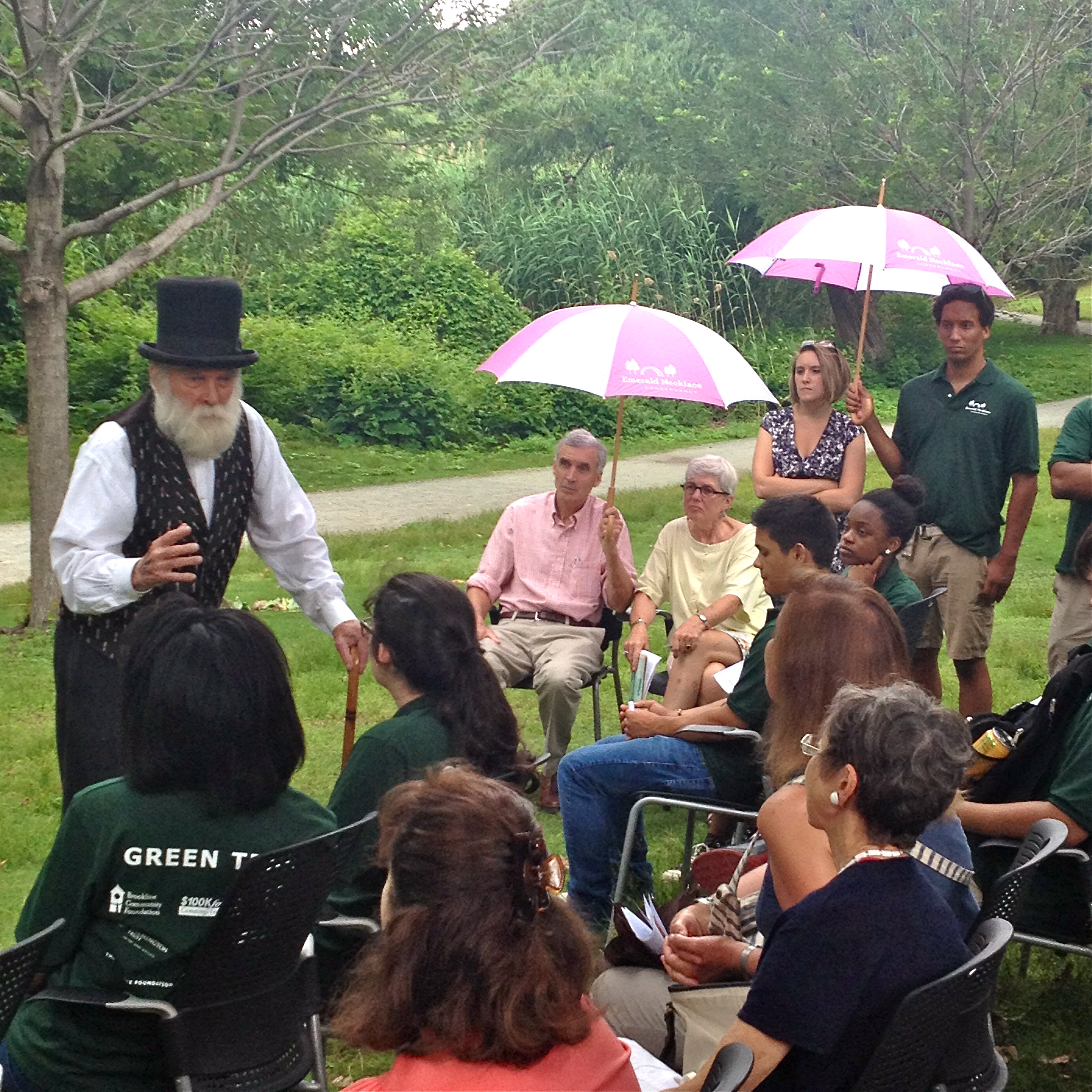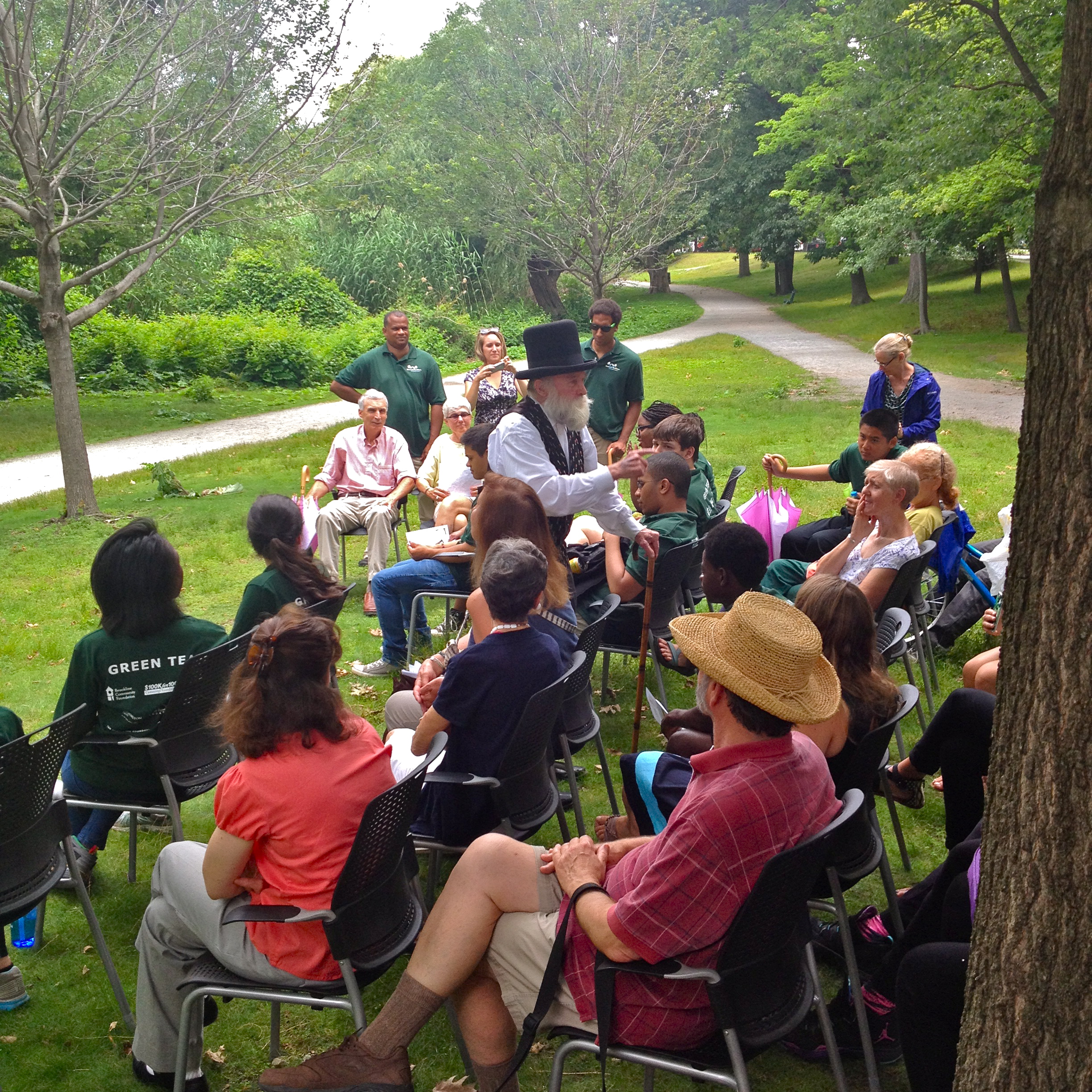 Amidst a hot and humid environment, “Olmsted” had the opportunity to speak and enter into dialogue with a group which was mostly composed of The Green Team, a group of teenage young people working with the Emerald Necklace Conservancy. These city kids were from neighborhoods throughout Boston, although the high majority were minority youth people who were having the opportunity to work outdoors in Olmsted’s Emerald Necklace.
