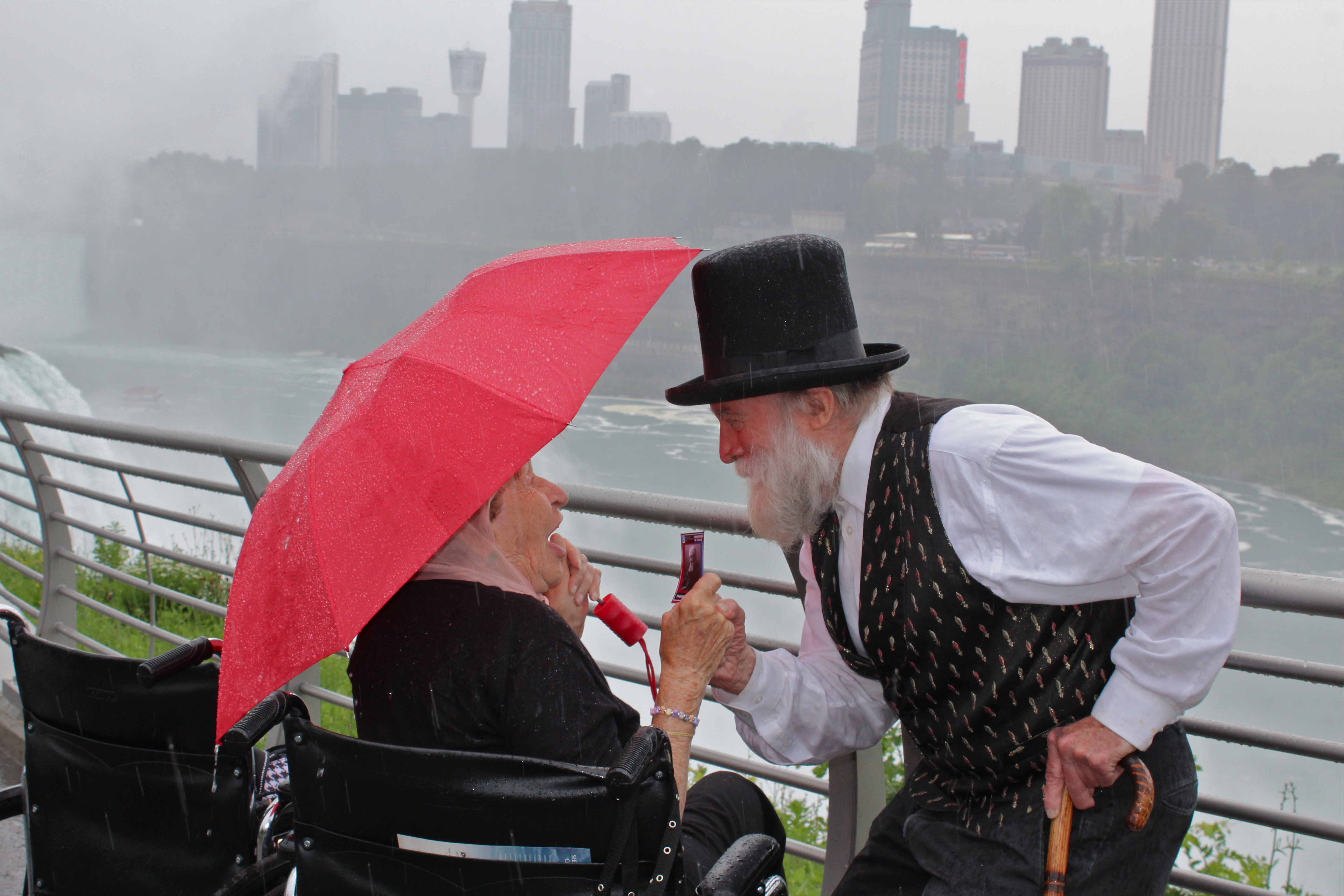 Olmsted and a visitor revel in the rain and the mist, enjoying the beauty of Niagara Falls